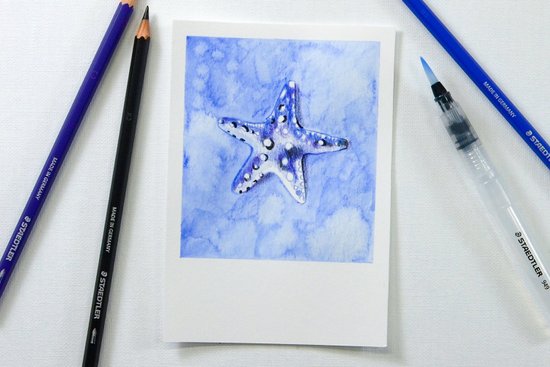 2. Árnyékoljuk sötétkékkel a tengeri csillag körüli területet. Fessük meg a hátteret az akvarell ecsettel. Ha élénk hátteret szeretnénk, cseppentsünk vízcseppeket a kissé nedves színbe.