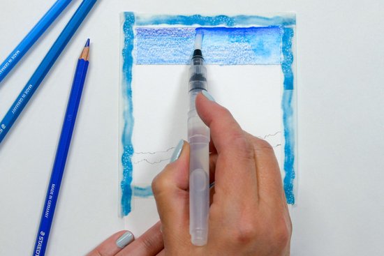 4. A permet fölött színezzük a vizet homokszínűre. Ezután váltsunk világos türkiz árnyalatra, majd a horizont felé a víz színét kék árnyalatokkal mélyítjük el. Hagyjunk vízszintes fehér foltokat, amelyek később a hullámok gerincét jelképezik majd.