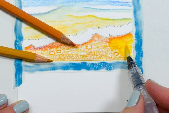 6 .Készítsük el a strandot okkersárga és vörösesbarna színnel. Rajzoljuk körbe a kis köveket, majd fessük meg a strandot, a víztartályos ecsetet enyhén nyomjuk a papírra.