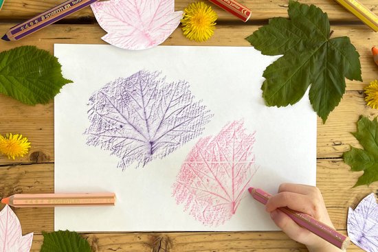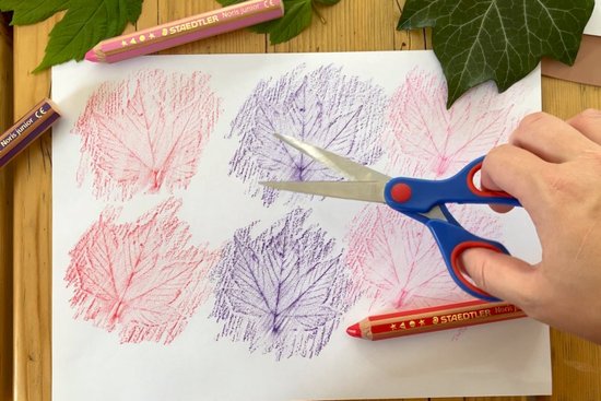 2. Helyezzük a leveleket egy vékony papírlap alá (a normál fénymásolópapír megfelelő erre a célra), és színes ceruzával vagy zsírkrétával satírozzuk át a leveleket, míg meg nem jelenik a teljes rajzolat a papíron. Az extra puha és élénk színű STAEDTLER "Noris® junior” színes ceruzákkal és zsírkrétákkal nagyszerű eredményt érhetünk el.