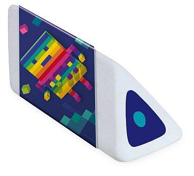 Az egyedi megjelenésű, díszített papírtokban rejlő háromszög formájú ceruzaradír mellett a szintén PVC és ftalátmentes radírstift is elkápráztat bennünket. Csavaró mechanizmusával könnyen használható, és praktikus kialakításának köszönhetően tiszta marad a tolltartóban.
