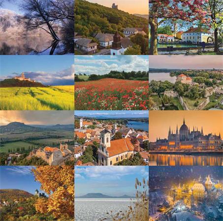 -naptár rész: magyar, angol, német nyelven, magyar  ünnepek  és névnapokkal, napkelte, napnyugta és holdállás  feltüntetésével